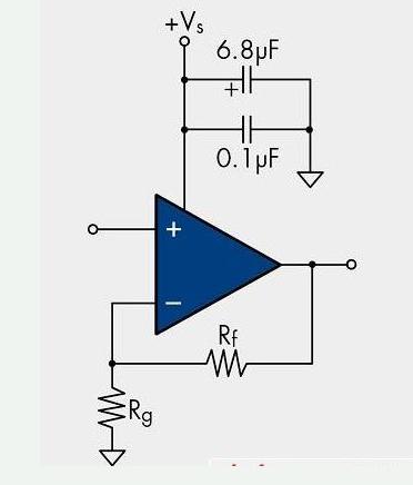 圖8:一個單電源放大器示例 (如果使用雙電源放大器,則只需在其它電源上增加相同的旁路電容即可)。