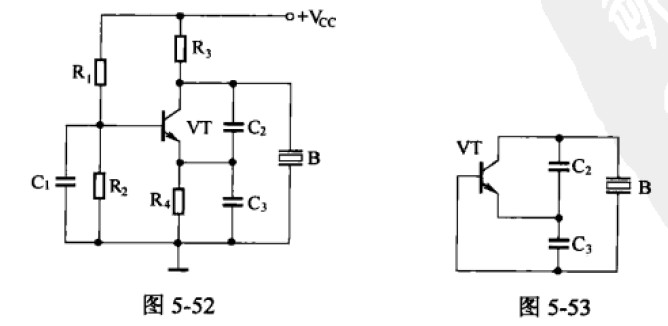 2.從圖5-53所示交流等效電路可見,這是一個(gè)電容三點(diǎn)式振蕩器,晶體B在這里等效為一個(gè)電感元件使用,與震蕩回路電容C2、C3一起組成并聯(lián)諧振回路,共同決定電路的振蕩頻率。