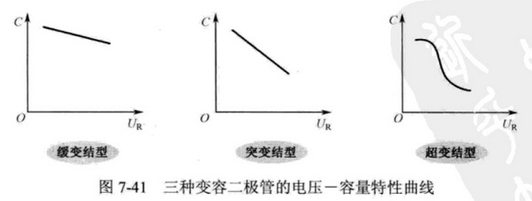 變?nèi)荻䴓O管按照PN結(jié)的結(jié)構(gòu)和結(jié)面附近雜質(zhì)的分布情況不同,可以分成緩變結(jié)、突變結(jié)和超變結(jié)三種類型,如圖7-41所示是三種變?nèi)荻䴓O管的電壓—容量特性曲線,圖中X軸方向變?yōu)樽內(nèi)荻䴓O管上的反向偏置電壓,Y軸方向為結(jié)電容。
