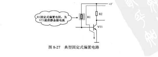 如圖8-28所示是負極性電源供電的NPN型三極管固定式偏置電路。電路中的VT1是NPN型三極管,-V是負極性直流電源,R1是基極偏置電阻,R1構成VT1的固定式基極偏置電路,R1可以為VT1提供基極電流。基極電流從地線(也就是電源的正極端)經R1流入三極管VT1的基極。