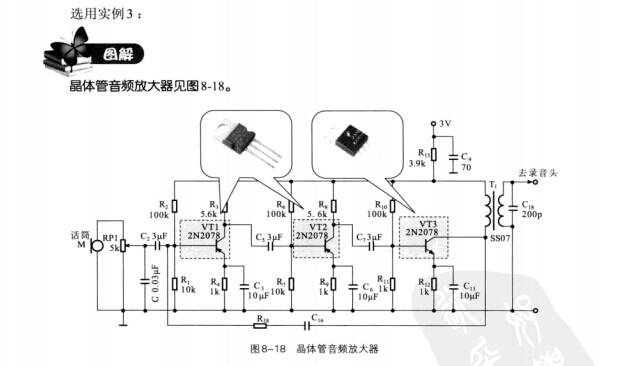 晶體管音頻放大器中,選用的三極管2N2078為美國(guó)產(chǎn)的有兩個(gè)PN結(jié)的晶體三極管,其中VT1和VT2為PNP型晶體三極管,VT3為NPN型晶體三極管。該放大器為一種是小型錄音機(jī)的音頻信號(hào)放大器,話筒信號(hào)經(jīng)電位器RP1后加到晶體管VT1上,該晶體管是一個(gè)共發(fā)射極放大器,音頻信號(hào)經(jīng)三極放大后加到變壓器T1的初級(jí)線圈上。經(jīng)變壓器T1將音頻信號(hào)送往錄音磁頭,同時(shí),VT3的集電極輸出經(jīng)R18、C16反饋到VT1的基極,用以改善放大器的頻率特性。在代換時(shí)應(yīng)注意晶體三極管的類型和型號(hào)。選擇時(shí)選擇同類開型晶體管替換。