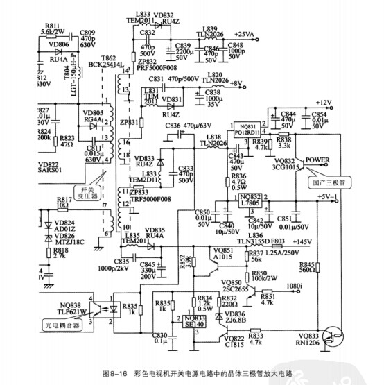 彩色電視機(jī)開關(guān)電源電路中的晶體三極管放大電路見圖8-16。