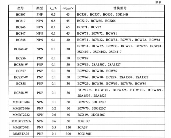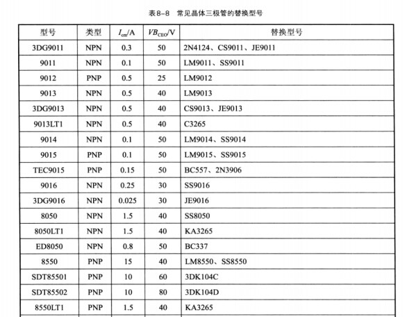 晶體三極管的型號(hào)和種類較多,不同種類晶體三極管內(nèi)部的參數(shù)也有所差異,若在代換時(shí),應(yīng)盡量選用同型號(hào)晶體三極管進(jìn)行代換,有些型號(hào)的晶體三極管若代換時(shí)無法找到同型號(hào)的,也可用其他型號(hào)進(jìn)行代換,常用型號(hào)晶體三極管的代換見表8-8所列。